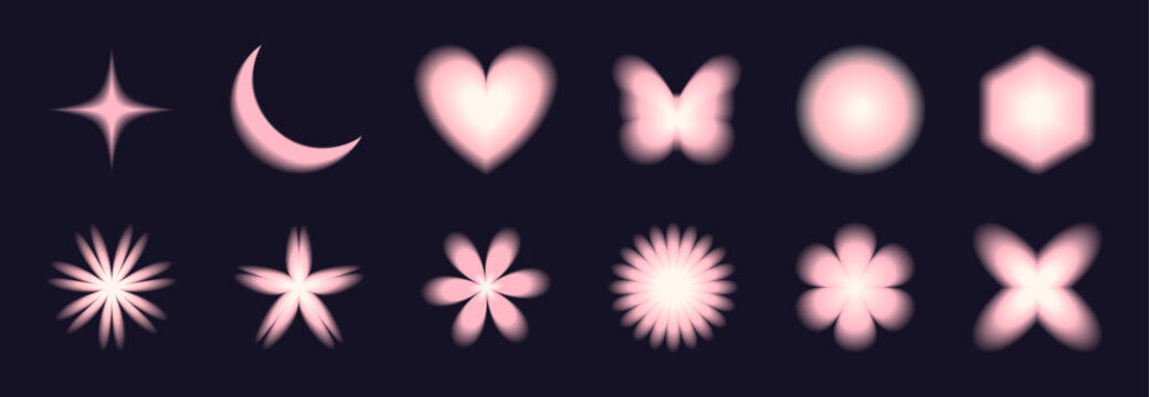 Set of y2k aura gradient shapes. Star, moon, heart, butterfly, flower symbols on dark background. Neon pink glow abstract icons with blurry effect.