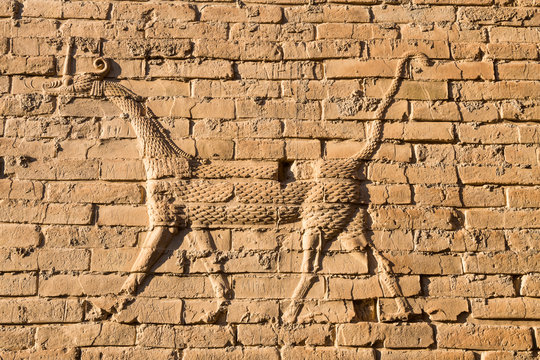 Mushussu (sirrush) and aurochs relief, Babylon, Iraq