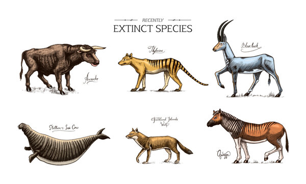 Extinct species. Wild mammal animals and birds. Tasmanian wolf, Quagga. Aurochs. Blue antelope. Steller's sea cow. Hand drawn vector engraved sketch. Graphic vintage style.