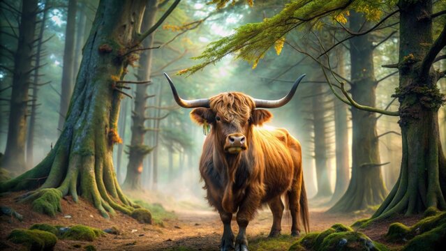 Majestic aurochs with curved horns and shaggy coat stands regally amidst misty forest surroundings with ancient trees towering above.