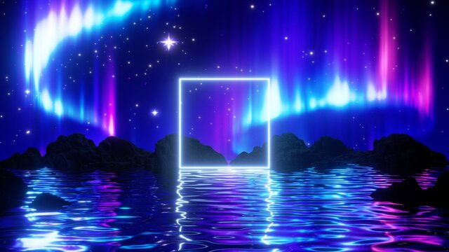 3d render, abstract background with Aurora Borealis. Northern lights in polar night sky above the mystical landscape. Natural phenomenon and neon glowing square frame