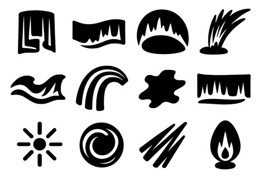Arctic Sky Icons. Arctic Sky Illumination silhouette set: auroral veil bar, polar shimmer band, glowing arc tile, ion-laced plume, chromatic wave crest, magnetospheric ribbon,