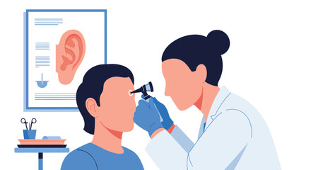 Doctor examining patient's ear with otoscope for medical checkup and diagnosis