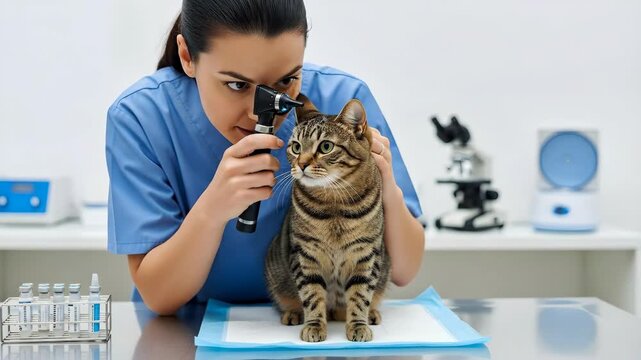 Veterinarian conducts thorough cat ear checkup using otoscope on exam table