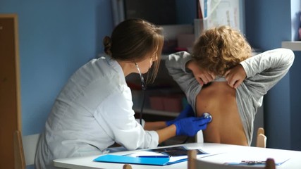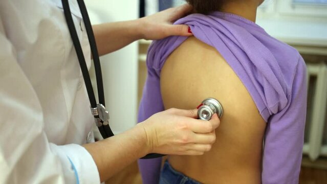 Female doctor and teenager at the clinic. The pediatrician examines the student at the reception. Listens with a stethoscope to the lungs from the back