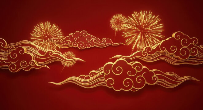 Vibrant red background features auspicious cloud pattern with intricate golden swirls, creating festive and elegant atmosphere. This design evokes feelings of celebration and prosperity