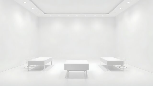 austere. Minimalist white room with simple square furniture and stark lighting. real-estate listings, architecture portfolios, designed for interior renovation comparisons for interiors.