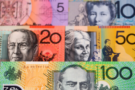 Australian dollar AUD is printed on polymer banknotes issued by National Bank of Australia in various denominations