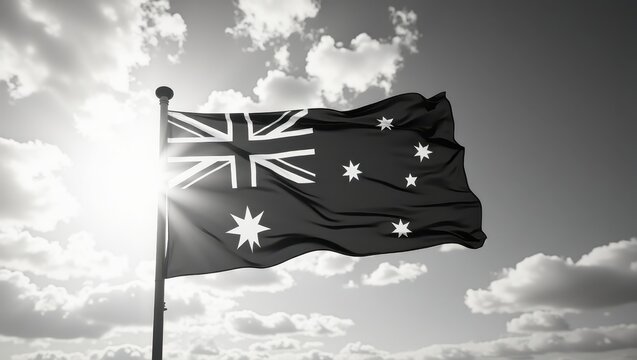 Australian flag with wavy silk folds, close-up view, fabric texture visible, national identity symbol on a neutral background.