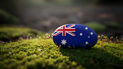 Australian flag painted rock on vibrant moss, dew-kissed, in a mystical forest. Ideal for Australia Day, travel blogs, national pride, environmental themes, cultural reverence,