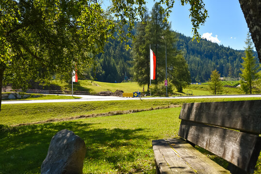 Seefeld, Austria - June 2017. Bench on walking route near Seefeld. Austrian flag and alps in the background.