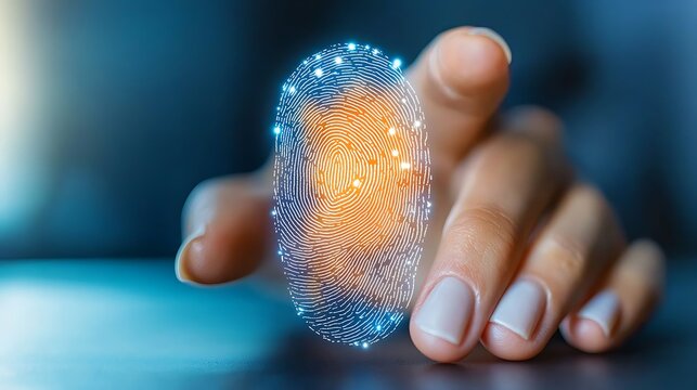 A person using a digital fingerprint scanner to authenticate identity, modern office with digital interface showing fingerprint data and access status, High-tech style