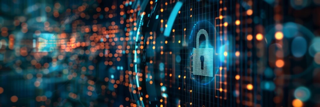 Businessman touching on virtual screen key lock for secure access, featuring a prominent digital lock icon and cyber security interface. Showcases modern technology for access authentication