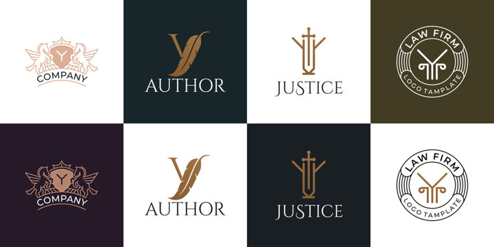 A collection of elegant vintage-style logos featuring law firm emblems, company emblems, author monograms, and symbols of justice.