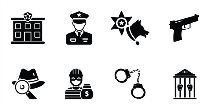 Police and Security Icon Set – Law Enforcement, Criminal, Jail, Gun, Police Dog, Detective, Handcuffs, and Justice Symbols for Design, Infographics, and Applications