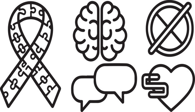 Hand-Drawn Neurodivergence Awareness Icons Autism Puzzle Ribbon, Brain Gears, Eye Contact Symbol, Speech Bubble, Heart and Mind Connection