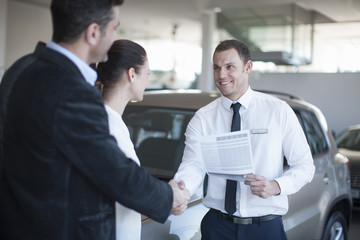 Mid adult couple making deal with salesman in car dealership