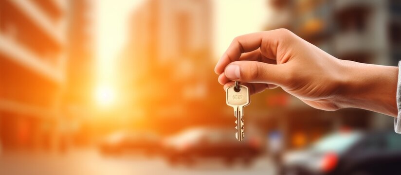 Expensive car dealer business. Automotive industry. Auto dealership office. A man holds the key to a new car in hands. Generative AI.