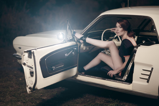 Junge attraktive Frau trägt 50/60er Jahre retro Fashion in einem Oldtimer