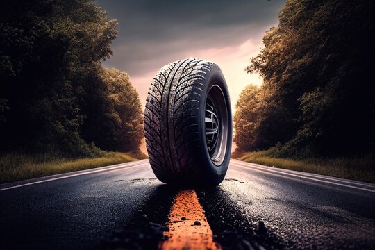 Tires car advertisement poster. Black rubber tyre set. Shining disk car wheel tyre. Summer or winter road. Information. Generative AI Store. Landscape banner, digital print, flyer, booklet,