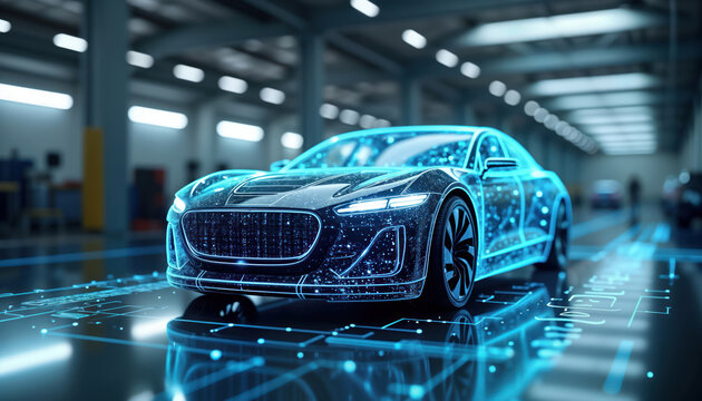 Futuristic EV car displayed on digital interface with virtual tech details. Modern auto tech concept in garage. Diagnostic screen shows complex data about vehicle. Electric vehicle repair concept.