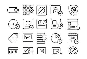 Line style icons of app blockers and time control: app block switch, distraction app tile, blocked icon overlay, work session lock, site block badge, timer-based block, scheduled app block, auto app