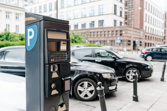 Person in the car inserting into or removing ticket from parking vending machine. Paying, entering parking lot or exiting garage concept. Daytime setting.