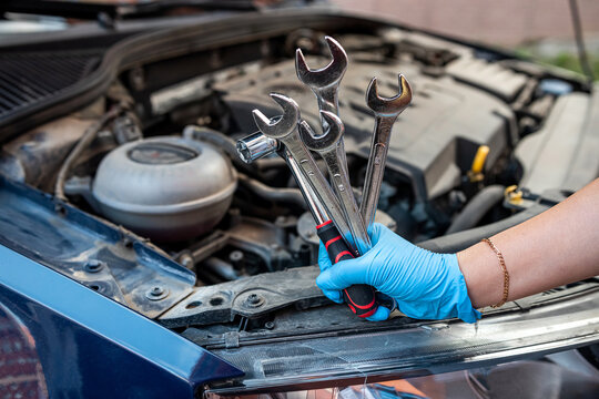New automotive spark plug on a dark workbench in a garage. Car engine maintenance, repair, and service concept. Close-up of auto parts and tools.