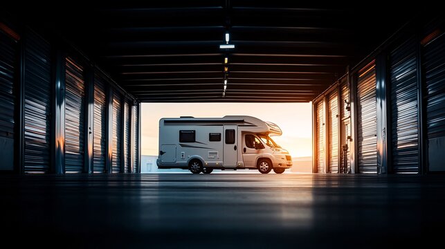 Motorhome parked inside storage facility. Sunset light shines through garage door on RV. Vehicle ready for road trip adventure. Safe parking for camper during travel season.
