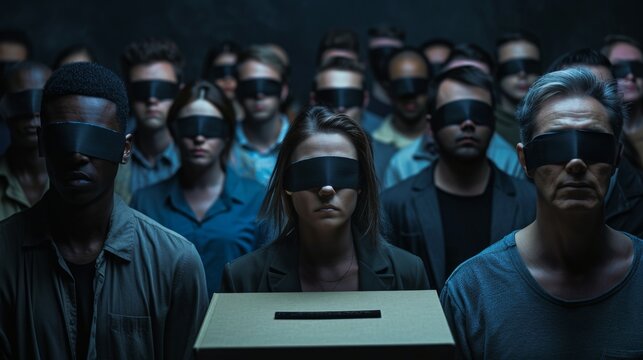 Blindfolded people voting, manipulated by politics and the media.
