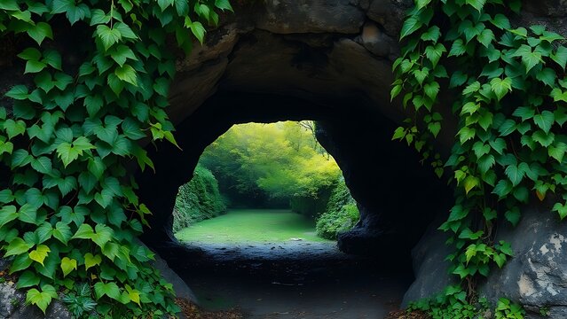 oligarchy. Entrance to an underground cave framed by green vines, dark interior contrasting with bright spring landscape. travel magazines.