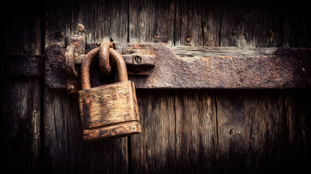 autocracy. A heavy rusted padlock securing a weathered wooden barn door. travel magazines, destination branding, designed for travel destination branding, drives exploration.