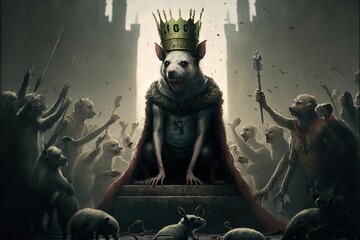 Autocratic politician rat on a throne with a crown on its head among a crowd, created with Generative AI technology