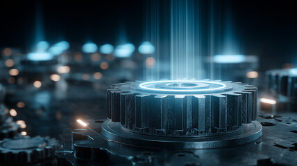 A mechanical gear emitting a digital projection symbolizing industrial technology precision engineering and automated efficiency.