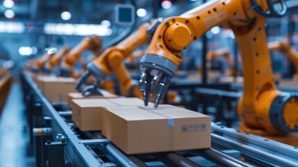 Automated robotic arm in a modern warehouse picking up cardboard boxes from a conveyor belt