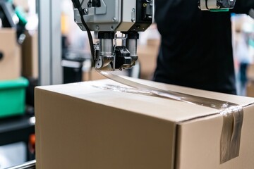 A close-up of a box being sealed by an automated machine, with packing tape stretching across the top
