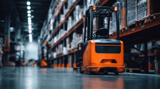 Electric forklift in warehouse with boxes on shelves creating efficient industrial logistics environment