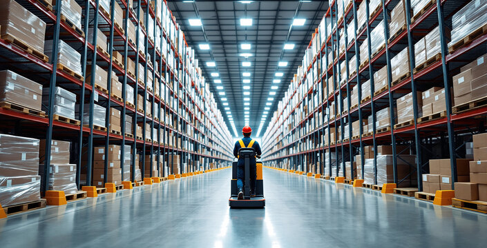 Worker rides electric pallet jack in automated warehouse with tall shelves full of boxes, under bright lights, symbolizing future logistics technology. Ai generative