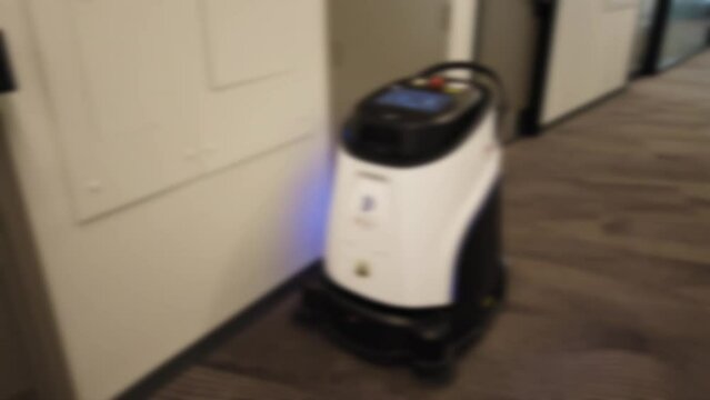 Robot vacuum cleaner cleans in the corridor of an office building. Toronto, Ontario, Canada. Out of focus.