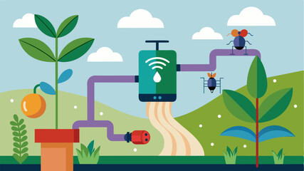 A smart irrigation system is connected to an IoTbased pest detection system allowing it to automatically adjust water usage in affected areas to combat pest outbreaks.. Vector illustration