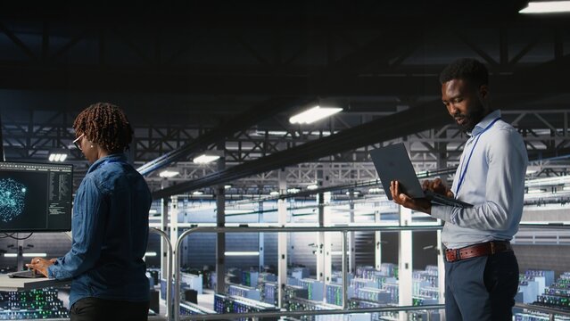 Data center engineering team on industrial platform collaborating to maintain blade servers. Technicians coordinating infrastructure tasks to support machine learning automatization of infrastructure