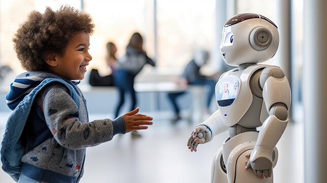 a little boy playing with a robot at an office building in the child is wearing a backpack and talking to him