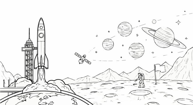 Detailed line art illustration of a rocket launch on the moon with planets and astronaut
