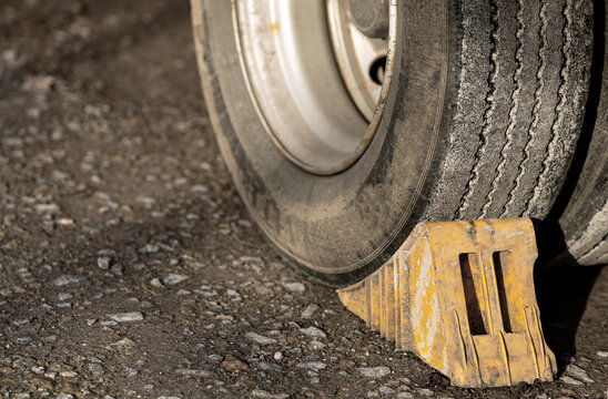 Yellow chock at the wheel of a parked truck