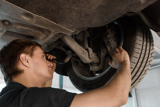 Automotive diagnostics technician garage workshop action photography industrial environment close-up view technology integration