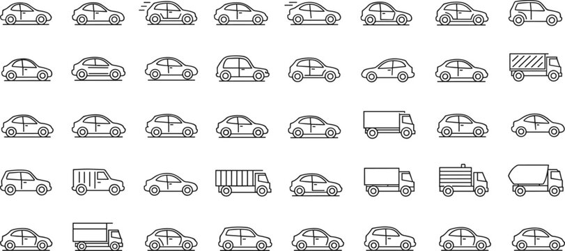 PrintVehicle icon set illustration, diverse car and truck outline drawings, transport symbols for design, automotive graphic elements, minimal line style collection