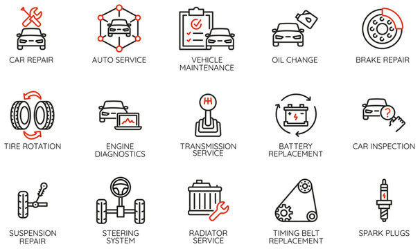 Vector set of linear icons related to automotive service, repair, maintenance, engine diagnostics for websites, mobile apps, infographics, car service, garages - part 1