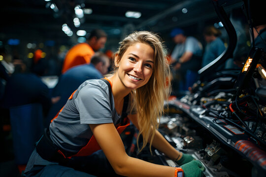Portrait of young beautiful Caucasian woman touching car hood smiling choosing vehicle in dealership. Confident slim charming buyer making decision purchasing new automobile indoors
