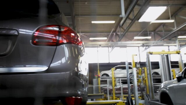 Luxury car in automotive plant with blurred assembly line background, indoors