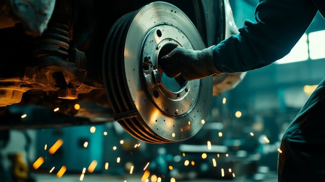 Close-up of mechanic working with car brake disc in auto repair shop, creating sparks. Industrial, mechanical maintenance, workshop.